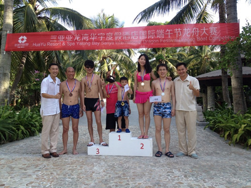 粽香飘逸、龙舟竞技,2014年亚龙湾华宇度假酒店端午龙舟大赛在一号游泳池开赛。来自酒店的26位客人在泳池内击水竞渡,欢度传统端午佳节。